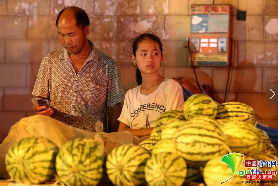 2016年7月10日夜晚,在河南省洛陽市老城街頭,宜陽縣高村鄉(xiāng)仟佰嶺村47歲的瓜農(nóng)石勛帶著12歲的女兒賣西瓜。“現(xiàn)在帶女兒賣瓜讓她體驗(yàn)一下瓜農(nóng)的艱辛是為了長大女兒不再賣瓜,我家種了四畝西瓜,從家里到洛陽開拖拉機(jī)要跑六個小時(shí),賣完西瓜回家趕,每天只能休息三個小時(shí),女兒去最遠(yuǎn)的地方就是洛陽城,一車西瓜賣完給女兒20塊零花錢,女兒很開心”。石勛說。