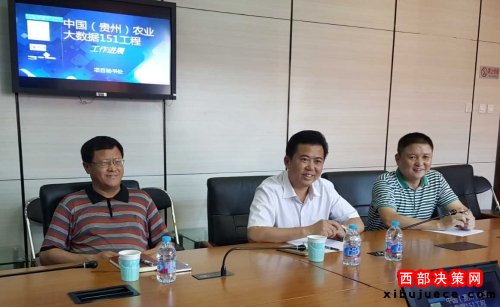 中國農(nóng)科院農(nóng)業(yè)信息研究所副所長(zhǎng)王文生(左一)、貴州省銅仁高新技術(shù)開發(fā)區(qū)管委會(huì)主任寇啟聰(中)與中國網(wǎng)大數(shù)據(jù)門戶網(wǎng)總裁謝金明(右一)聽取工程進(jìn)展匯報(bào)
