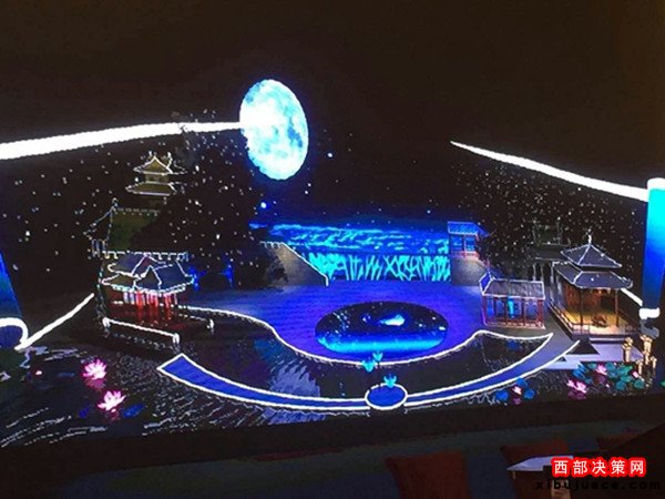 今年秋晚的舞美設(shè)計制作本著厲行節(jié)約的原則,對演播現(xiàn)場現(xiàn)有的實景建筑做了最大化的利用。晚會以中國目前最大的仿唐建筑群紫云樓為觀眾席背景,在廣場一側(cè)的人工景觀湖上搭建舞臺。舞臺主體通過一幅展開的中國傳統(tǒng)畫軸形象,將西安城墻和大明宮角樓等元素有機(jī)地結(jié)合到一起,實現(xiàn)臺在水上、水在臺中的夢幻效果,營造出一種穿越千年、貫通古今的浪漫。