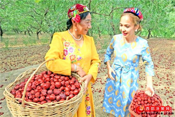 五堡鎮(zhèn)拉甫喬克村的棗農(nóng)熱孜瓦古麗·卡德爾(左)和前來(lái)幫忙的鄰居交談。