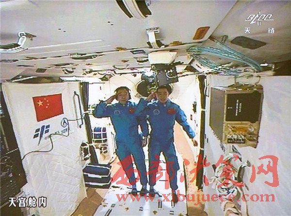 10月19日,神舟十一號(hào)航天員景海鵬和陳冬順利進(jìn)入天宮二號(hào)實(shí)驗(yàn)艙。景海鵬(左)和陳冬在天宮二號(hào)實(shí)驗(yàn)艙向全國(guó)人民問(wèn)好并敬禮(攝于北京航天飛行控制中心大屏幕)。