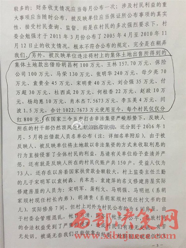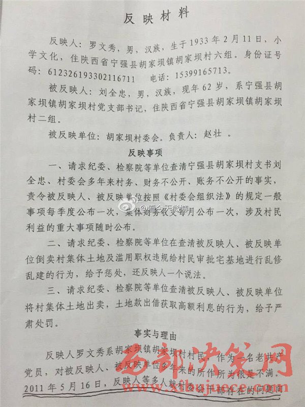 西部決策網(wǎng)訊 近日,有網(wǎng)友微博爆料,陜西省漢中市寧強(qiáng)縣胡家壩鎮(zhèn)胡家壩村,村干部劉全忠利用惠民政策,套取國家大量資金。對(duì)于國家扶貧項(xiàng)目,巧立名目、貪污、侵占村民利益。濫用職權(quán)違規(guī)審批宅基地,倒賣村集體土地,并將村上千萬余元出借他人賺取利息,且村務(wù)不公開、賬務(wù)弄虛作假、嚴(yán)重違紀(jì)行為。