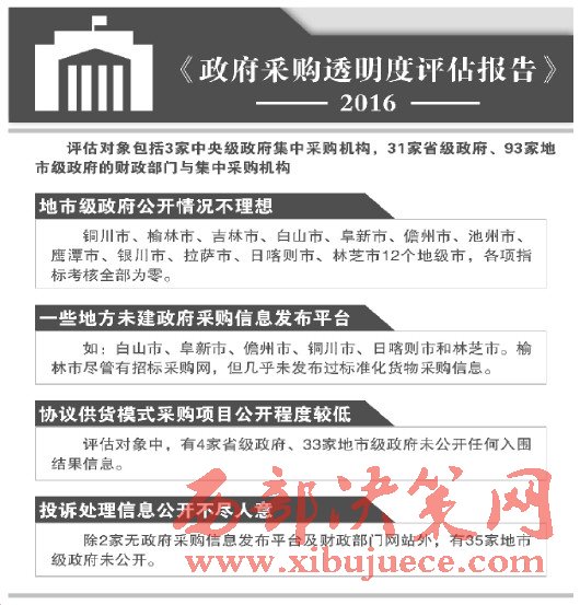 《報告》披露:我國政府采購信息公開情況仍不理想。主要表現(xiàn)為:地市級政府公開情況不佳。其中,陜西省銅川市、榆林市、吉林省吉林市、白山市、遼寧省阜新市、海南省儋州市、安徽省池州市、江西鷹潭市、寧夏銀川市以及西藏拉薩市、日喀則市和林芝市等12個地級市,在政府采購信息透明度各項指標(biāo)考核中全部為零分,在93家地市級政府成績排比中墊底。
