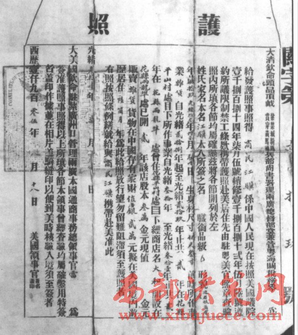 1905年8月18日,廣東花縣人江驥的護(hù)照,由時(shí)任兩廣總督岑春煊簽發(fā),并有美國(guó)廣州總領(lǐng)事雷伏禮的簽證