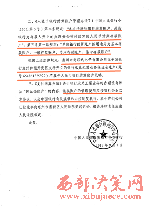 人行惠州分行則認(rèn)定,涉案保證金賬戶不屬于人民幣銀行結(jié)算賬戶管理范籌,無需經(jīng)當(dāng)?shù)厝嗣胥y行核準(zhǔn)和備案,保證金賬戶的資金劃轉(zhuǎn)、使用在不違反國(guó)家法律、法規(guī)的前提下,由銀行和單位協(xié)商,按協(xié)議辦理。