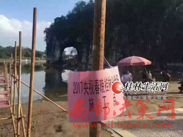 為了真正體現(xiàn)東西南北中,全民大聯(lián)歡,2017年央視春晚延續(xù)2016年春晚特色,特別設置了東西南北四大分會場,桂林憑借秀美的山水風光和厚重的歷史文化底蘊,被確定為2017年央視春晚南方分會場。17日上午,景俊海一行來到2017年央視春晚桂林分會場外景地象山景區(qū)。象鼻山被薄霧籠罩,如夢似幻,漓江煙波渺渺,美不勝收,山水和諧相融構成了中國南方最具代表性的自然美景。從11月12日起,春晚桂林分會場舞臺搭建工作已經(jīng)進場,工人正在用一根根鋼管搭建水上舞臺。