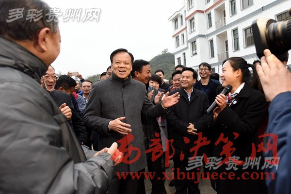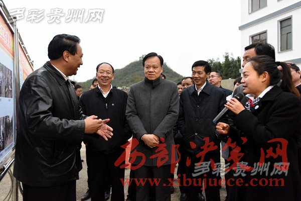 陳敏爾一行認(rèn)真聽取黔西縣綠化鄉(xiāng)馬坎村安置點(diǎn)“兩短”“兩長”的產(chǎn)業(yè)脫貧致富路子的介紹