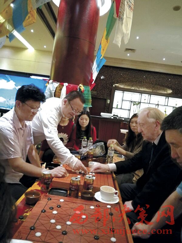 阿旺邊巴(左一)與外國藏棋研究學者交流藏棋文化。