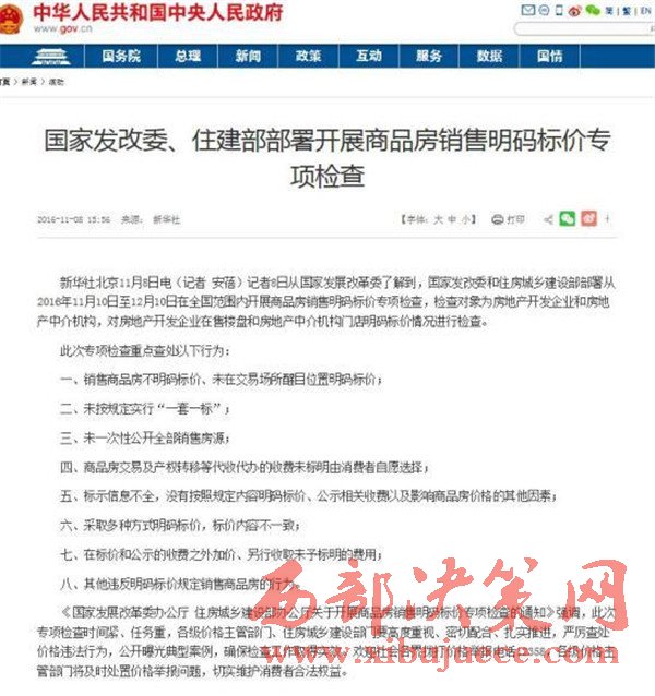 近日,國家發(fā)改委及住建部聯(lián)合發(fā)布了對商品房“明碼標(biāo)價(jià)”的新一輪整治措施。部署從2016年11月10日至12月10日在全國范圍內(nèi)開展商品房銷售明碼標(biāo)價(jià)專項(xiàng)檢查。此次專項(xiàng)檢查重點(diǎn)查處以下八類行為。“明碼標(biāo)價(jià)”、“一套一標(biāo)”、“醒目”、“自愿”、“一致”成為重點(diǎn)關(guān)鍵詞。