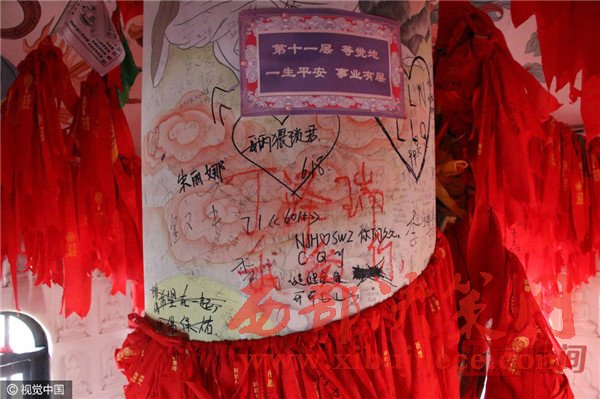 日前,向游客免費開放的山東省無棣縣大覺寺海豐塔內(nèi)壁遭到游客涂鴉,幾乎每一層內(nèi)墻壁都被刻滿了情話和祝福語,連墻壁裝飾的佛像圖畫都不能幸免。圖為海豐塔內(nèi)壁遭游客涂鴉,刻滿了情話和祝福語。
