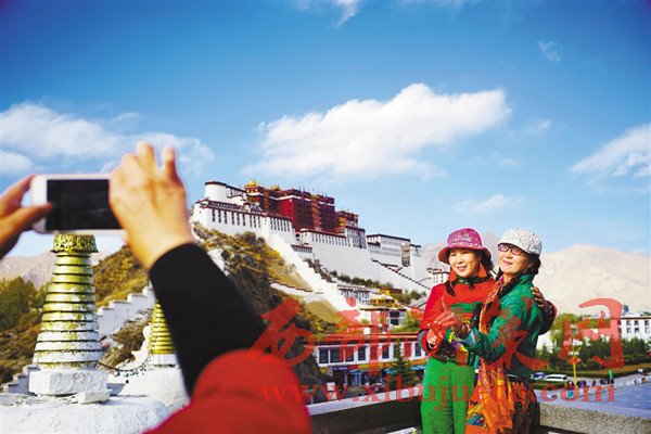 圖為游客在布達(dá)拉宮觀景臺拍照留念。