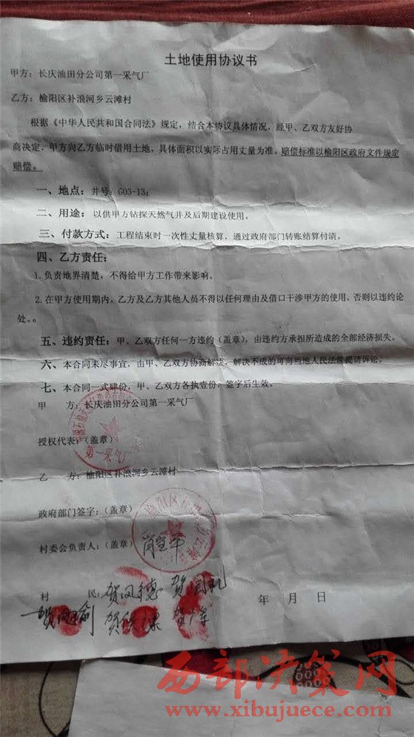 日前,陜西榆林榆陽(yáng)區(qū)補(bǔ)浪河一村民反映,長(zhǎng)慶油田采氣一廠在他們村征地鉆探天然氣井,村民懷疑長(zhǎng)慶采氣一廠和他們村委會(huì)簽定的《土地使用協(xié)議書(shū)》存在著嚴(yán)重的問(wèn)題。村民向記者看了一份所謂的巜土地使用協(xié)議書(shū)》,記者看到這份漏洞百出的協(xié)議書(shū),協(xié)議書(shū)的甲方是長(zhǎng)慶油田采氣一廠分公司,而協(xié)議書(shū)公章是中國(guó)石油天然氣長(zhǎng)慶股份有限公司(……)分公司,幾個(gè)關(guān)鍵的字根本看不清楚,不知道這個(gè)沒(méi)有蓋清楚公章的協(xié)議書(shū)到底想掩蓋什么?還是這枚公章就是一枚假公章。協(xié)議書(shū)的甲方名稱為什么和公章名稱不符呢?