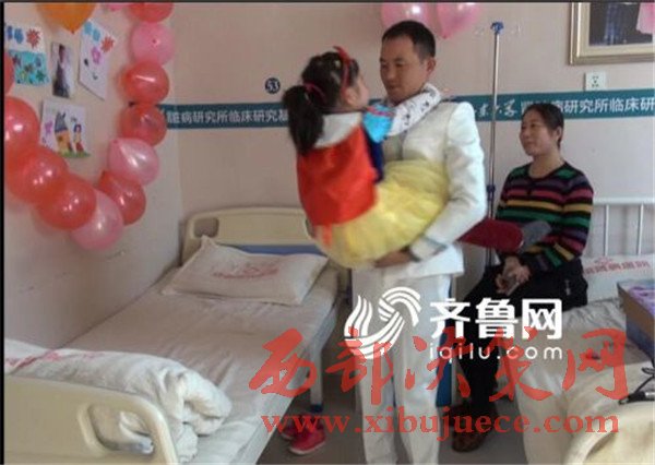 這個6歲女孩穿上了最喜歡的公主泡泡裙,與父親史新站手拉手,伴隨著婚禮進行曲走進病房。