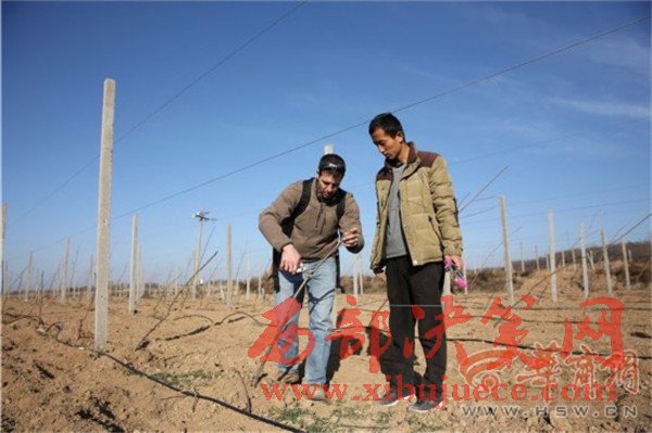 12月8日上午8時(shí)30分,淳化縣卜家鎮(zhèn)蔣家山村,當(dāng)?shù)毓r(nóng)剛吃完早飯,林東已從100多公里外的西安趕到這里,他一邊用熟練的中文問(wèn)大家“咥飽了沒(méi)有”,一邊從背包里掏出果樹(shù)剪刀,走進(jìn)地里查看樹(shù)苗的過(guò)冬情況。果園的技術(shù)員拿個(gè)大本子跟在林東后邊做記錄,遇到難點(diǎn)林東就親自示范。