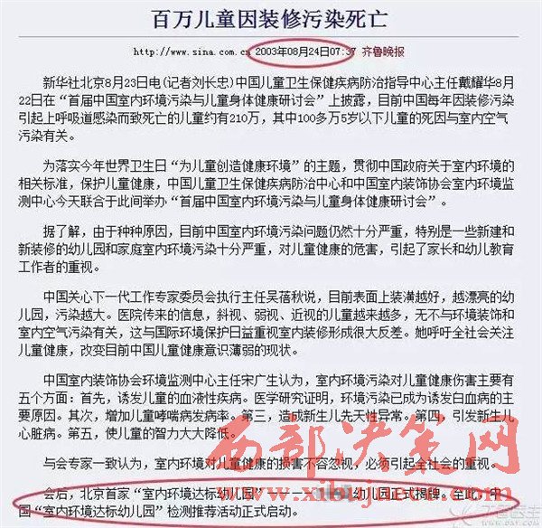 日,在廣東省室內(nèi)環(huán)境衛(wèi)生行業(yè)協(xié)會(huì)主辦的“關(guān)注嬰幼兒室內(nèi)環(huán)境、關(guān)愛嬰幼兒健康成長”高峰論壇上,中國工程院院士、呼吸疾病國家重點(diǎn)實(shí)驗(yàn)室主任鐘南山發(fā)表了《室內(nèi)空氣污染與嬰幼兒健康》的演講。鐘南山在演講中引用了中國環(huán)境保護(hù)協(xié)會(huì)有關(guān)統(tǒng)計(jì)資料:90%白血病患兒家中曾進(jìn)行過豪華裝修,每年210萬兒童死于豪華裝修;80%的家庭裝修甲醛超標(biāo);70%孕婦流產(chǎn)和環(huán)境污染有關(guān);每年我國因室內(nèi)環(huán)境污染引起的死亡人數(shù)高達(dá)11.1萬人。