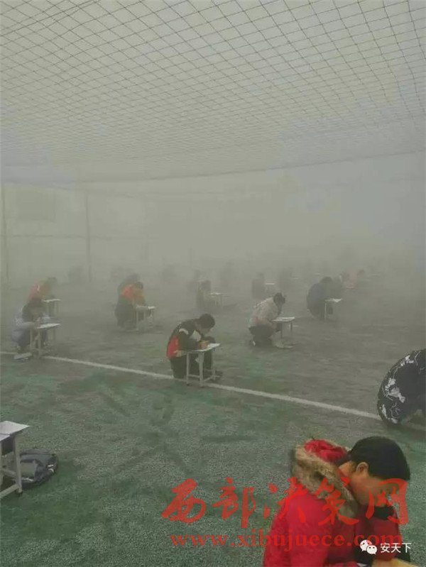 投訴人閆先生給記者發(fā)來兩張照片,照片顯示,天氣灰蒙蒙的,在一個(gè)露天的足球場上,很多學(xué)生半蹲著趴在凳子上做卷子,由于霧霾太大,第2排后面的學(xué)生身影已經(jīng)很模糊。20日下午3時(shí)50分左右,大河報(bào)記者趕到林州,當(dāng)?shù)氐目諝忪F霾十分嚴(yán)重,能見度只有二三百米。在臨淇鎮(zhèn)一中學(xué)校附近,記者見到了閆先生。他告訴記者,現(xiàn)在學(xué)校已經(jīng)知道記者要來采訪了,臨時(shí)放假了,考試也取消了。隨后,在校門口,該校八年級(jí)的一名學(xué)生告訴記者,學(xué)校確實(shí)確實(shí)在12月19日考試了,上午考英語和數(shù)學(xué),下午考語文和物理。該學(xué)生告訴記者,八年級(jí)共十個(gè)班,每個(gè)班六七十人,大家都參加了考試,“在操場上考的,搬著凳子在外面”。
