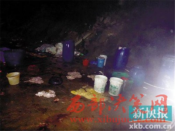 在查獲現(xiàn)場(chǎng),違法人員臨時(shí)搭建的私宰帳篷里,地上鋪滿了豬血和豬毛的混合物,生豬糞便隨著水流漸漸形成一條“小河”流向遠(yuǎn)處,殺豬刀、鐵鉤、鐵叉等用于私宰的工具隨意擺放在地上,與豬毛、豬血、糞便等混合在一起。現(xiàn)場(chǎng)一口直徑近2米的大鍋盛滿了水,熱氣騰騰。