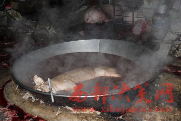 執(zhí)法人員稱,這口大鍋是用來(lái)給生豬褪毛的,隨后就在這露天的骯臟環(huán)境下進(jìn)行屠宰和分割、裝填貨車(chē),這種情況屠宰出來(lái)的豬肉其質(zhì)量可想而知。