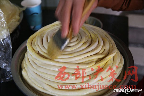 問賀玉蘭老人做得一碗好面有啥竅門,賀玉蘭老人說:“有啥竅門?實(shí)實(shí)在在做就成,一個(gè)是面要揉好、揉成光光亮亮的軟面團(tuán),揉好的面醒2個(gè)小時(shí)后就可以搓成粗條子盤放在盆子里,一層層碼放,刷上菜籽油,一個(gè)是防止面粘在一起,另外也能使面口感更爽滑,盤放好后再醒2個(gè)小時(shí)。”