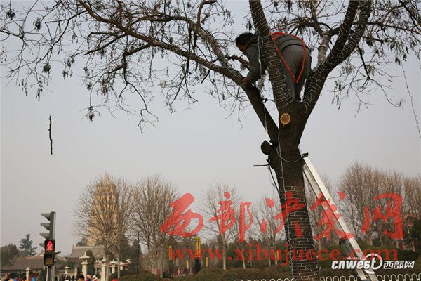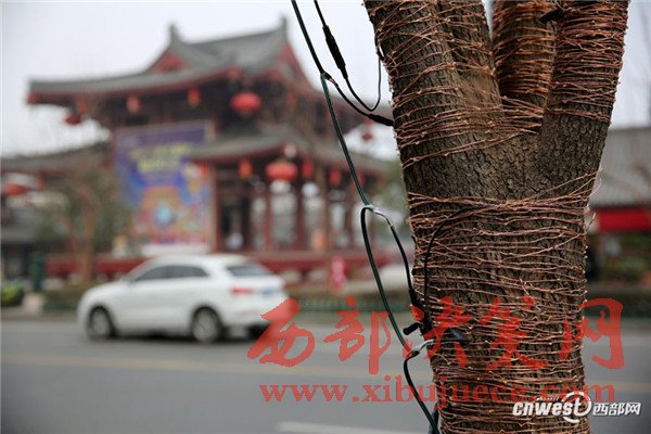 春節(jié)不遠 工人爬樹綁彩燈點亮街頭樹