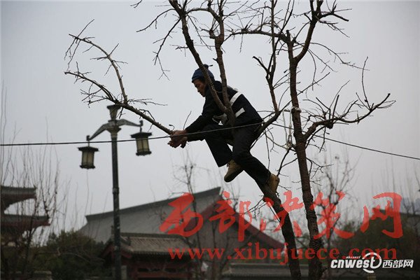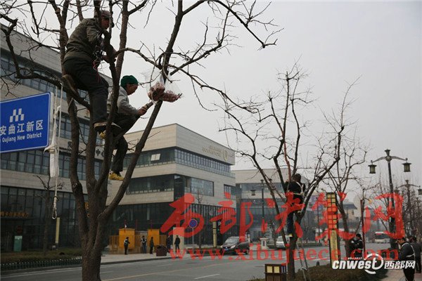 12月24日,西安市曲江新區(qū)芙蓉南路、雁塔南路,不少工人爬到樹上綁彩燈。一名正在樹上往樹枝上一圈一圈纏繞彩燈的師傅說:“綁一棵樹的彩燈一人得花半天到一天時間。”