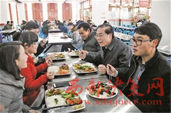 圖為于叢樂(右二)與學(xué)生一起在學(xué)院食堂共進(jìn)午餐