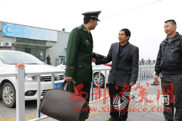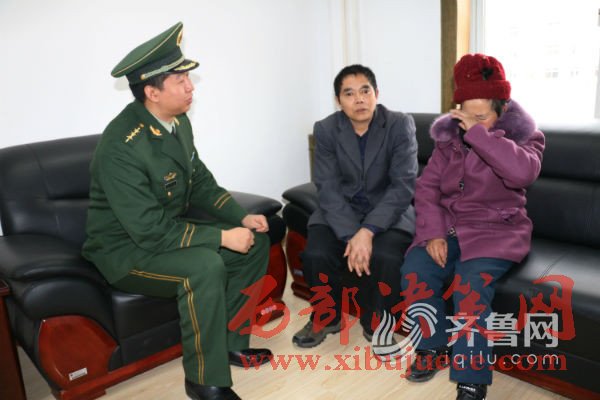 1月9日,周開樹在南黃邊防派出所為母親開具無戶籍證明后,然后帶母親來到青島,當(dāng)天下午坐上了青島至成都的火車,坐在火車上,周開樹的眼前又浮現(xiàn)出當(dāng)年的情景,一個(gè)11歲的少年,緊緊拉著母親的手:“媽媽,您別走,長(zhǎng)大后我養(yǎng)活您……”圖為周開樹與南黃邊防派出所民警見面。