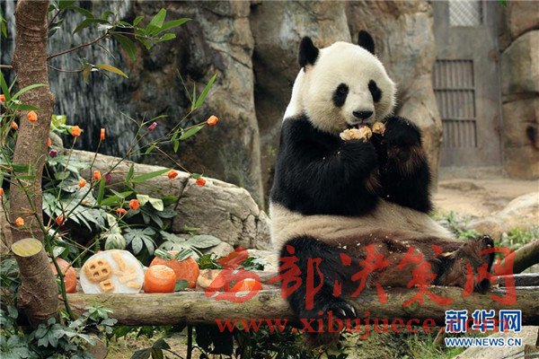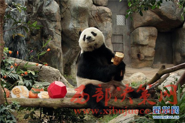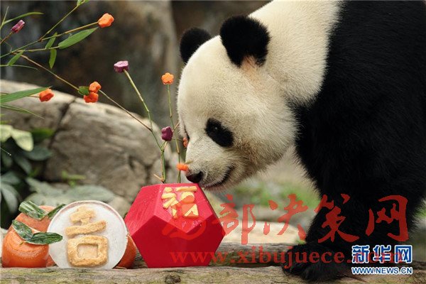 1月16日,在香港海洋公園,大熊貓樂樂準(zhǔn)備享用新春大餐。當(dāng)日,香港海洋公園的工作人員用紅薯、紫薯、胡蘿卜和竹筍為大熊貓樂樂精心制作新春大餐。