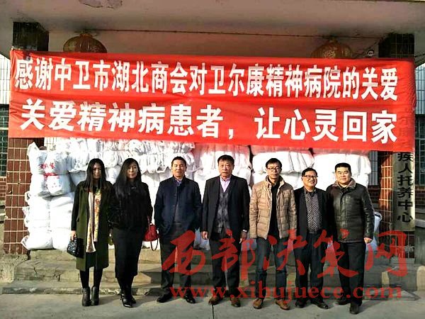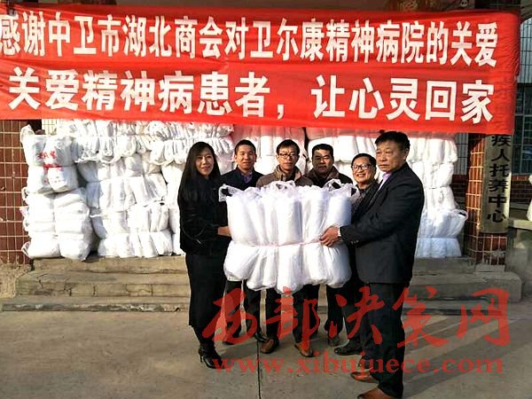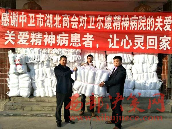 西部決策網(wǎng)訊(黃貞  楊新)2017年1月9日,中衛(wèi)市湖北商會一行數(shù)人在會長朱秀東的帶領(lǐng)下,前往中衛(wèi)市衛(wèi)爾康精神病醫(yī)院進行新年前慰問,并送去價值2萬余元的過冬棉被。