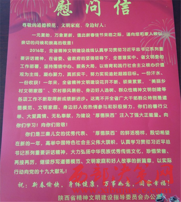西部決策網(wǎng)訊(馮江博)新年伊始,為了充分體現(xiàn)黨和政府對道德模范、身邊好人的關(guān)心關(guān)愛,1月22日,洛川縣委宣傳部、縣文明辦組織開展道德模范、身邊好人新春慰問幫扶活動,為我縣屈萬平、李貴玲、成林蓬、王國慶、米龍飛等道德模范、身邊好人送去米、面、油等節(jié)日慰問品和慰問金。
