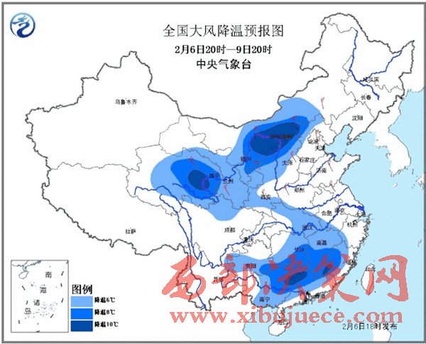 中央氣象臺預(yù)計,6日夜間至9日,我國中東部大部地區(qū)都將自北向南將先后出現(xiàn)大范圍大風(fēng)降溫和雨雪天氣,平均氣溫將普遍下降4℃以上,其中,青海東部、陜西北部、內(nèi)蒙古中部、山西北部、貴州東南部、湖南中南部、江西中南部、福建西部、廣西北部和廣東北部等地氣溫將下降8℃以上,局地超過10℃!長江以北地區(qū)并伴有4——6級偏北風(fēng),東部和南部海區(qū)風(fēng)力有7——9級。
