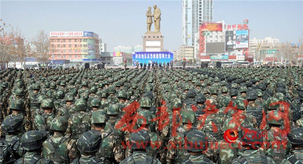 參加阿克蘇地區(qū)反恐維穩(wěn)誓師大會的武警官兵整裝待發(fā)。