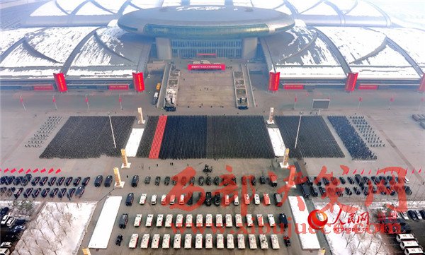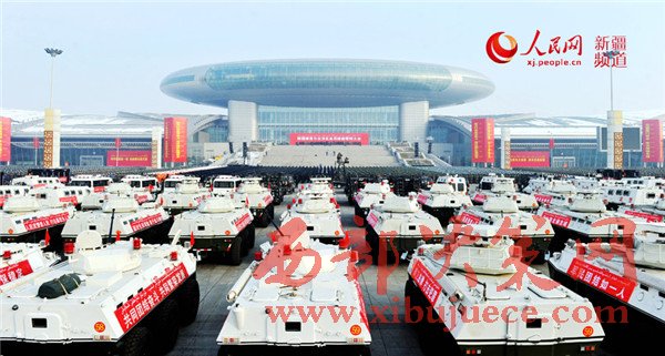 新疆國際會展中心廣場上,1萬余名武警官兵、公安民警、民兵預(yù)備役人員等各維穩(wěn)力量緊握鋼槍盾牌、整齊列隊(duì)挺立,直升機(jī)在空中盤旋,一輛輛軍車、裝甲車、摩托車列隊(duì)待發(fā)。