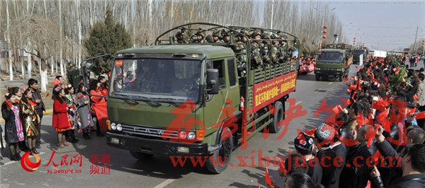 喀什市民在道路兩旁歡迎參加自治區(qū)反恐維穩(wěn)誓師大會的武警官兵。