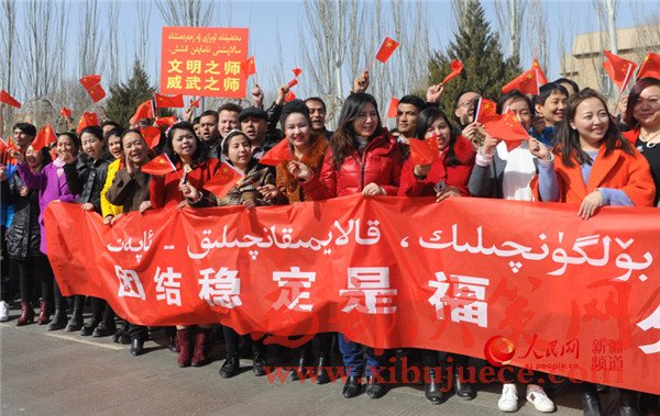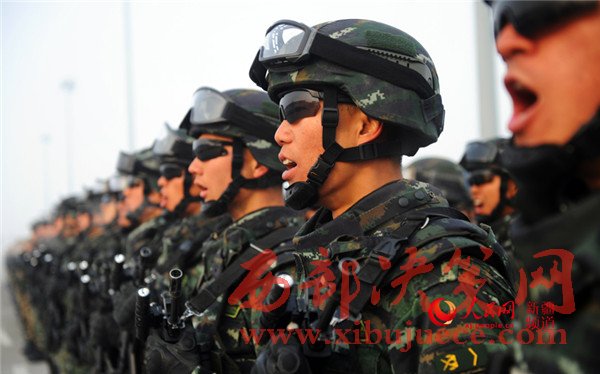 “聽黨指揮、能打勝仗、作風(fēng)優(yōu)良!”參加誓師大會的全體維穩(wěn)力量聲震長空,有力宣示了全疆各族干部群眾堅定不移貫徹社會穩(wěn)定和長治久安總目標(biāo)的堅定決心,展示了各維穩(wěn)力量忠誠勇敢、無堅不摧、敢打必勝的強(qiáng)大戰(zhàn)斗力,彰顯出新疆各族人民同仇敵愾、堅決戰(zhàn)勝暴恐分子的共同意愿。