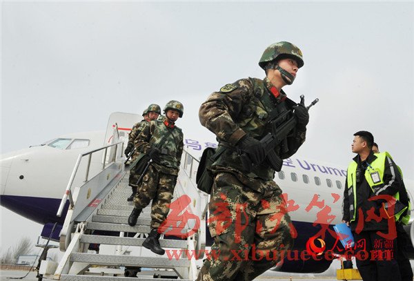 參加反恐維穩(wěn)誓師大會的武警官兵到達(dá)喀什機(jī)場,向任務(wù)區(qū)進(jìn)發(fā)。