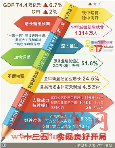 發(fā)展新動能不斷增強。創(chuàng)新驅(qū)動發(fā)展戰(zhàn)略深入實施??萍碱I(lǐng)域取得一批國際領(lǐng)先的重大成果。新興產(chǎn)業(yè)蓬勃興起,傳統(tǒng)產(chǎn)業(yè)加快轉(zhuǎn)型升級。大眾創(chuàng)業(yè)、萬眾創(chuàng)新廣泛開展,全年新登記企業(yè)增長24.5%,平均每天新增1.5萬戶,加上個體工商戶等,各類市場主體每天新增4.5萬戶。新動能正在撐起發(fā)展新天地。