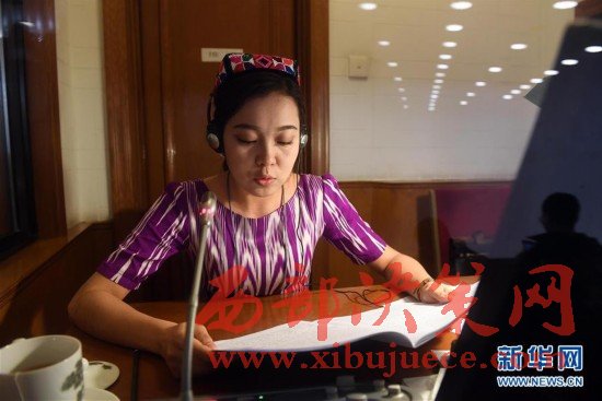 3月5日,民族語文翻譯組工作人員買熱巴·莫合買提在人民大會堂對十二屆全國人大五次會議開幕會進(jìn)行同聲傳譯。