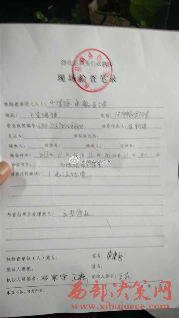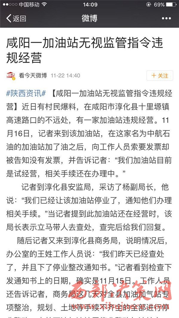 記者到淳化縣安監(jiān)局,采訪了楊副局長,他說:“我們已經(jīng)讓該加油站停業(yè)了,通知他們辦理相關(guān)手續(xù)。”當(dāng)記者提到此加油站還在經(jīng)營時,該局長表示立馬帶人去查處,查完后給我們回復(fù)。隨后記者又來到淳化縣商務(wù)局,說明情況后,辦公室的王姓工作人員說:“我們昨天已經(jīng)查處了,并且下了停業(yè)整改通知書。”記者看到檢查下發(fā)通知書上的日期,確實是11月15日。