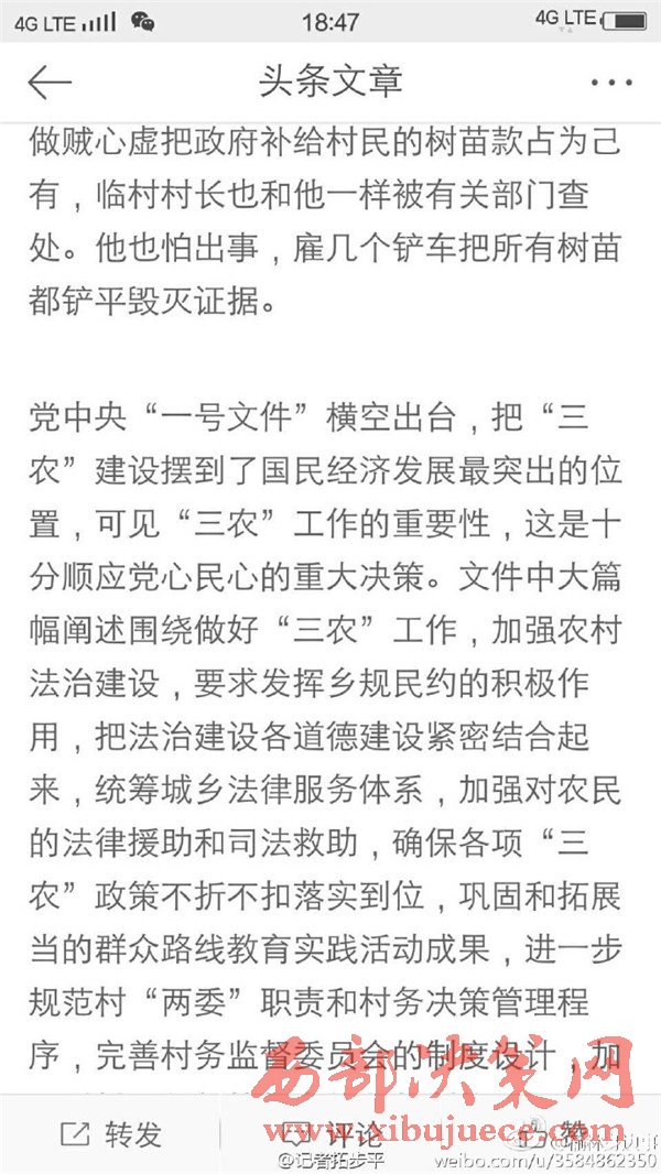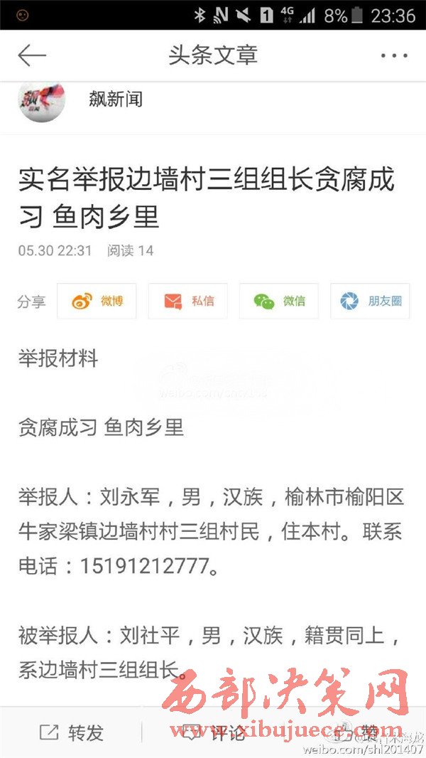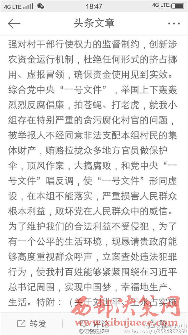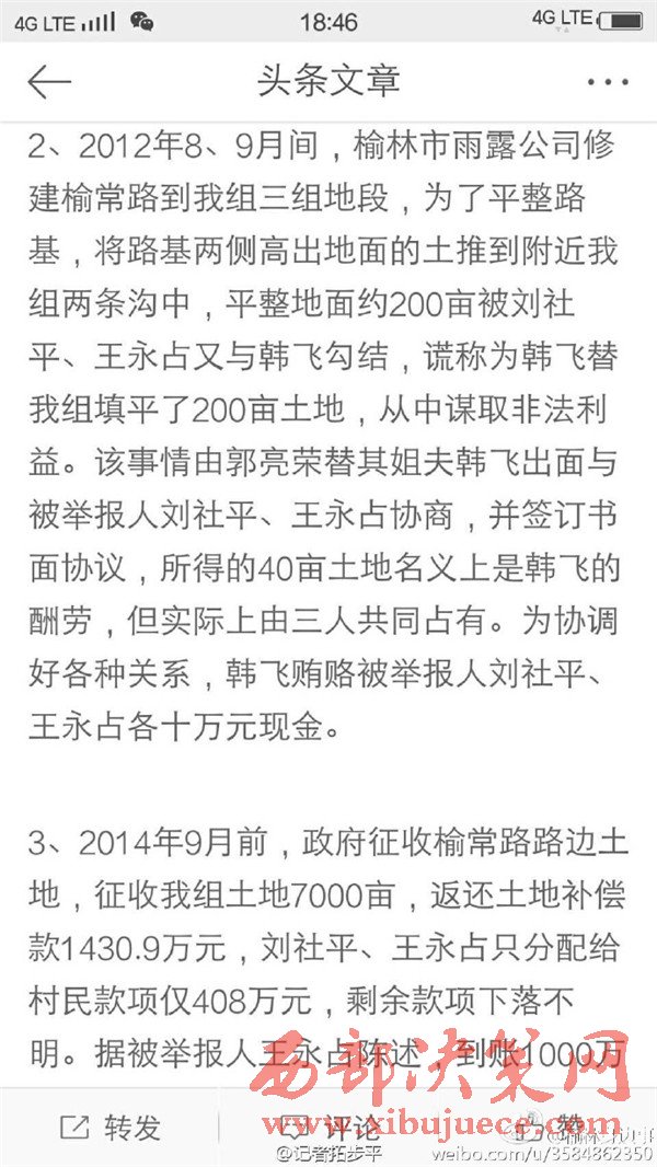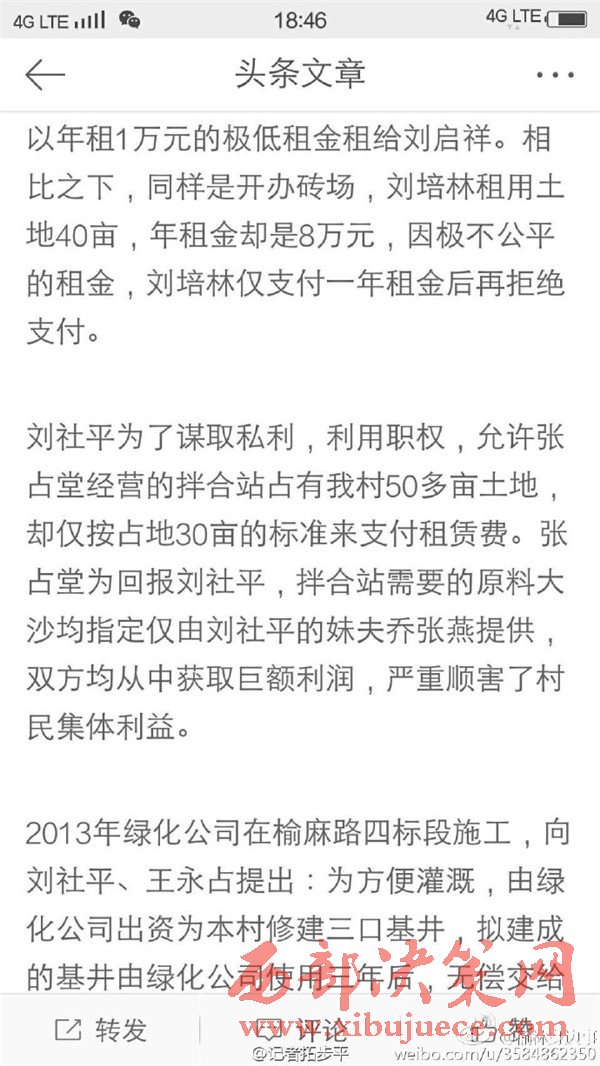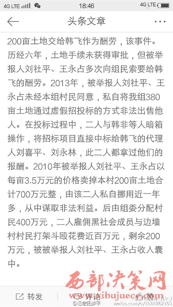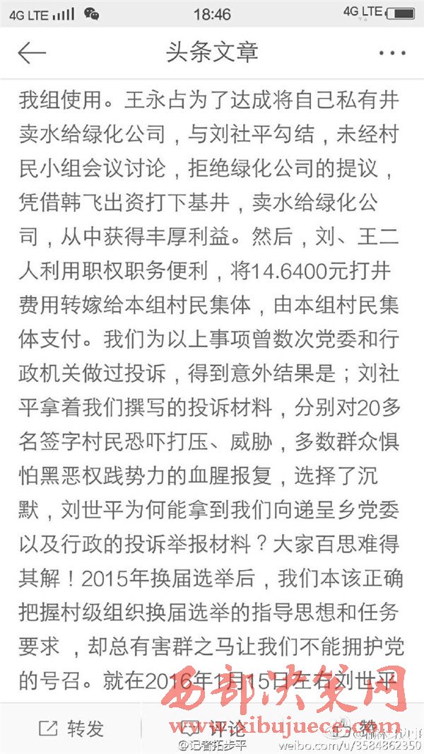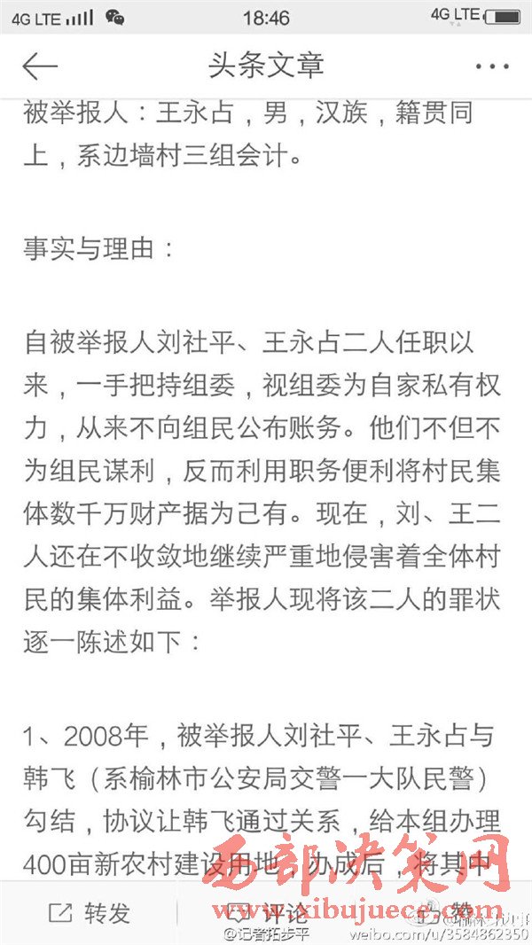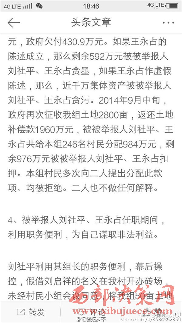 近日有微博網友飆新聞微博爆料:自被舉報人劉社平、王永占二人任職以來,一手把持組委,視組委為自家私有權力,從來不向組民公布賬務。他們不但不為組民謀利,反而利用職務便利將村民集體數千萬財產據為己有。請相關部門調查回復!