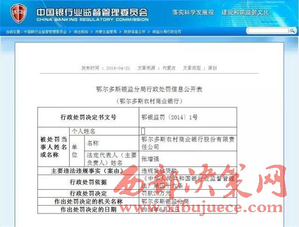 另查明:鄂爾多斯農(nóng)村商業(yè)銀行法人張?jiān)鰪?qiáng),又是內(nèi)蒙古信用聯(lián)合社理事會(huì)理事,共產(chǎn)黨黨員,管理不善,多次因非法經(jīng)營(yíng)舉報(bào),其中2012年2月29日,因違規(guī)簽發(fā)承兌匯票被內(nèi)蒙古銀監(jiān)局罰款50萬(wàn)。
