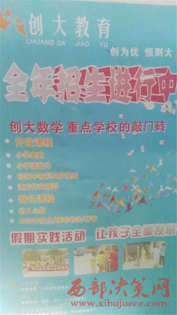 家長為了讓孩子能全面發(fā)展,常年穿梭于各類興趣、輔導(dǎo)班而樂此不疲。有的家長為了讓孩子上個好學(xué)校,托熟人、找關(guān)系,掏天價送孩子上所謂的名優(yōu)輔導(dǎo)機構(gòu),而實際上實屬無奈,敢恨不敢言,這一現(xiàn)象不得不讓人深思……!實際情況到底怎樣?本社工作人員根據(jù)群眾反映近期對一家名為“創(chuàng)大教育”的輔導(dǎo)班進行實地了解,結(jié)果讓人大跌眼鏡。