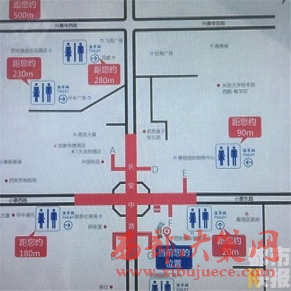 在這個(gè)指示牌的地圖上,除了標(biāo)注出“所在位置”以及周邊的標(biāo)志性地點(diǎn),還醒目的標(biāo)出了周圍的衛(wèi)生間地點(diǎn)。圖上標(biāo)明,在小寨十字,周圍一共有七個(gè)可用衛(wèi)生間,最遠(yuǎn)的一個(gè)距離280米,最近的一個(gè)距離只有20米。