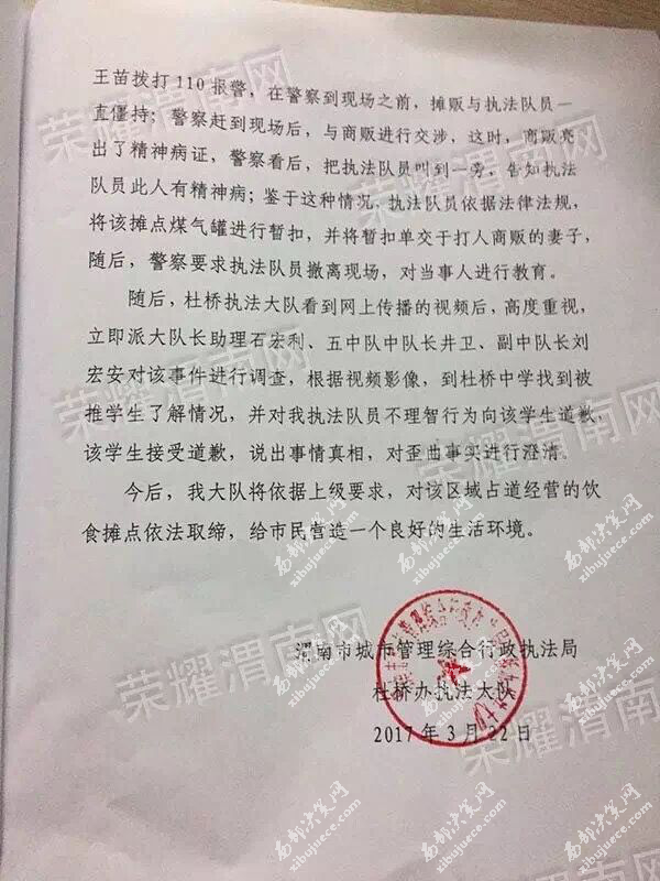 當(dāng)晚6點(diǎn)以后,涉事執(zhí)法隊(duì)員所屬執(zhí)法大隊(duì)杜橋執(zhí)法大隊(duì)書面回復(fù)便在網(wǎng)絡(luò)中被網(wǎng)友們不斷的轉(zhuǎn)載。據(jù)該回復(fù)稱:2017年3月22日中午12時(shí)40分左右,杜橋執(zhí)法大隊(duì)市容機(jī)動(dòng)中隊(duì)謝鵬、朱勇、康忠民、王苗等4名執(zhí)法隊(duì)員在杜橋中學(xué)門前取締占道經(jīng)營飲食攤點(diǎn),當(dāng)時(shí)有八個(gè)攤點(diǎn)在此經(jīng)營,七個(gè)已勸離,其中一戶不愿離開,與執(zhí)法隊(duì)員康忠民發(fā)生言語沖突,在康忠民要求其搬離此處,禁止銷售時(shí),攤點(diǎn)經(jīng)營者情緒激動(dòng),突然,用鋼管圓凳子砸向執(zhí)法隊(duì)員康忠民,致使康忠民胳膊、背部等多處軟組織損傷,執(zhí)法隊(duì)員謝鵬、王苗等見狀,立即趕到康忠民處進(jìn)行勸導(dǎo),在勸導(dǎo)過程中,杜橋中學(xué)一名學(xué)生說城管打人,不明真相的約五六十名學(xué)生一起起哄、謾罵城管,因康忠民被打,情緒比較激動(dòng),見學(xué)生歪曲事實(shí),上前推了一下起哄的學(xué)生,隨后,機(jī)動(dòng)中隊(duì)執(zhí)法隊(duì)員朱勇、陳新亮、魏楠、徐嬌、姜寧寧、孫偉珍趕到現(xiàn)場,準(zhǔn)備對該攤點(diǎn)煤氣罐進(jìn)行暫扣,在執(zhí)法隊(duì)員朱勇關(guān)閉液化氣罐閥門時(shí),攤點(diǎn)經(jīng)營者用鋼管圓凳砸向朱勇手臂處,致使朱勇左前臂及手背部多處軟組織損傷,打完人后,打人攤販妻子將凳子抓住,阻止攤販再次打人,這時(shí),攤販用左手抓起攤位上的刀具,威脅城管隊(duì)員,并大聲說“這是市長讓他在此擺攤”,這時(shí),旁邊另一名攤販上前奪取打人攤販左手所持的刀具;為了不與攤販再次發(fā)生肢體上的沖突,執(zhí)法隊(duì)員王苗撥打110報(bào)警,在警察到現(xiàn)場之前,攤販與執(zhí)法隊(duì)員一直僵持;警察趕到現(xiàn)場后,與商販進(jìn)行交涉,這時(shí),商販亮出了精神病證,警察看后,把執(zhí)法隊(duì)員叫到一旁,告知執(zhí)法隊(duì)員此人有精神??;鑒于這種情況,執(zhí)法隊(duì)員依據(jù)法律法規(guī),將該攤點(diǎn)煤氣罐進(jìn)行暫扣,并將暫扣單交于打人商販的妻子,隨后,警察要求執(zhí)法隊(duì)員撤離現(xiàn)場,對當(dāng)事人進(jìn)行教育。