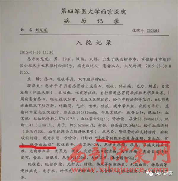 2015年3月我小兒子劉龍龍由感冒引發(fā)急性尿毒癥第五期,從此我們一家過(guò)上了人間少有的被恐懼包圍的日子。時(shí)至今日我們輾轉(zhuǎn)榆林星元醫(yī)院、西安西京醫(yī)院、西安交大附屬醫(yī)院等大醫(yī)院治療,前后做了8次血漿置換腹膜透析手術(shù)。每天透析3、4次,每一個(gè)月病人住院花費(fèi)四、五萬(wàn)元。2年時(shí)間花費(fèi)110多萬(wàn)元,現(xiàn)在就靠透析維持生命。因此醫(yī)生對(duì)我說(shuō),我兒子做透析不是長(zhǎng)久之計(jì),唯