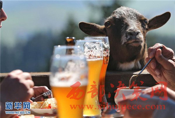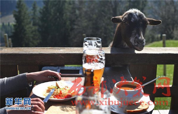 3月27日,在德國(guó)南部塞格附近的一家戶(hù)外餐館,一只山羊向正在用餐的客人討要食物。