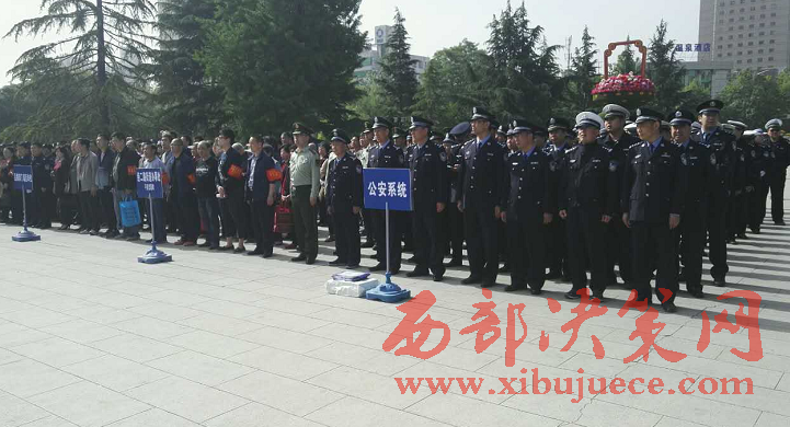 西部決策網(wǎng)-西部大開發(fā)訊(帥華鋒 杜杰)5月6日上午,渭濱區(qū)在炎帝園廣場隆重舉行打造“經(jīng)二路平安示范一條街” 夏季攻堅行動推進會,市委政法委及區(qū)委、區(qū)人大、區(qū)政府、區(qū)政協(xié)相關領導出席現(xiàn)場,公安、執(zhí)法、區(qū)級部門、平安單位、社區(qū)志愿者組成五個方陣共300余人參加會議。