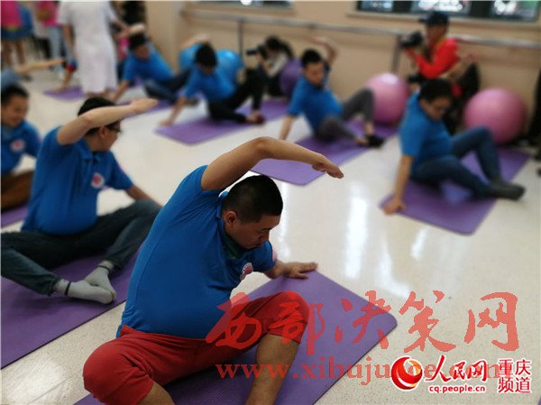 準(zhǔn)爸爸們體驗孕婦瑜伽,幾分鐘后,不少人累得氣喘吁吁。