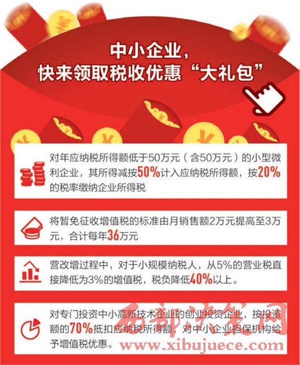 日前國務(wù)院常務(wù)會議決定,在今年已出臺4批政策減稅降費(fèi)7180億元的基礎(chǔ)上,繼續(xù)出臺多項降費(fèi)舉措,預(yù)計每年可再減輕企業(yè)負(fù)擔(dān)2830億元,合計全年為企業(yè)減負(fù)超過1萬億元。今年以來,國家持續(xù)推出減稅降費(fèi)措施,讓企業(yè)輕裝上陣,成為推進(jìn)供給側(cè)結(jié)構(gòu)性改革、培育我國競爭新優(yōu)勢的重要舉措。就在國務(wù)院出臺多項降費(fèi)舉措的同時,財政部、國家稅務(wù)總局也發(fā)出通知,將享受所得稅優(yōu)惠政策的小型微利企業(yè)年應(yīng)納稅所得額上限由30萬元提高至50萬元,自2017年1月1日至2019年12月31日,對年應(yīng)納稅所得額低于50萬元(含50萬元)的小型微利企業(yè),其所得減按50%計入應(yīng)納稅所得額,按20%的稅率繳納企業(yè)所得稅。