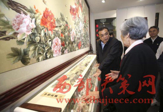 李克強(qiáng)2017年5月8日晚來(lái)到開(kāi)封七盛角民俗文化街,在王素花汴繡館長(zhǎng)時(shí)間駐足。82歲的王素花多年繼承創(chuàng)新宋代傳統(tǒng)刺繡工藝,是汴繡領(lǐng)軍人物。總理仔細(xì)觀賞后稱(chēng)贊她用色“多而不雜”,技藝“爐火純青”。